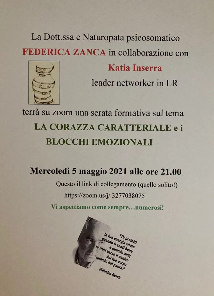 La CORAZZA CARATTERIALE e i BLOCCHI EMOZIONALI | con Katia Inserra 5 Maggio 20216 Maggio 2021 Federica Zanca